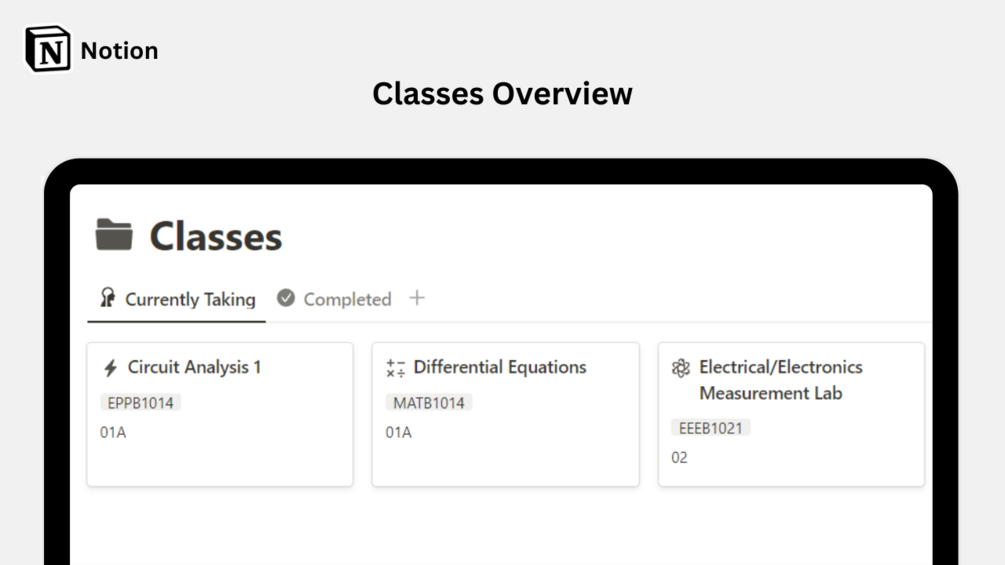 An all-in-one digital system to manage your student life, allowing you to track all the important and relevant information you need to stay on top of your studies such as tasks, assignments, upcoming exams, grades and more. Capture and organize everything, from notes to resources with this system.