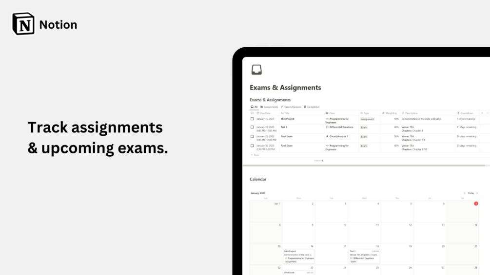 An all-in-one digital system to manage your student life, allowing you to track all the important and relevant information you need to stay on top of your studies such as tasks, assignments, upcoming exams, grades and more. Capture and organize everything, from notes to resources with this system.